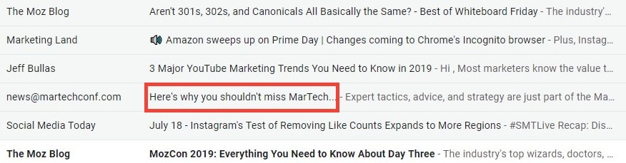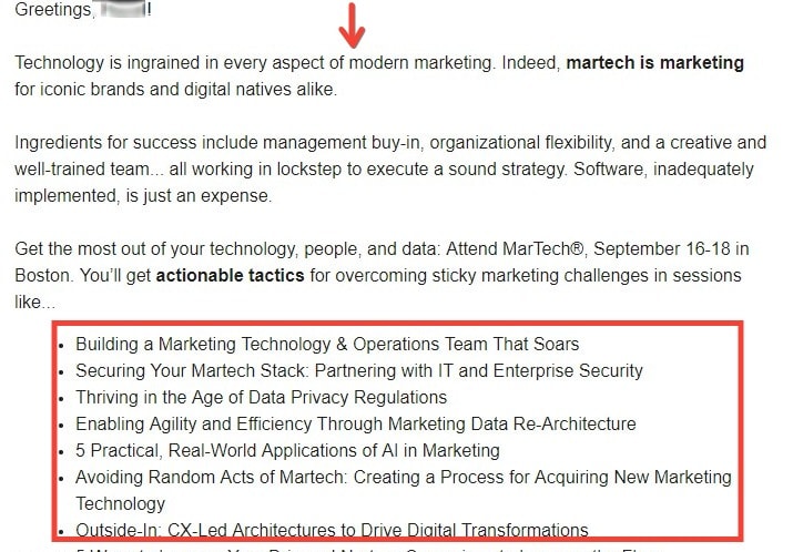 Customers understand benefits more than features. Hence, write copy that addresses the WIIFM (what’s in it for me) for your target audience. Check out how this email from the MarTech Conference 2019 talks about the benefits of attending the event.