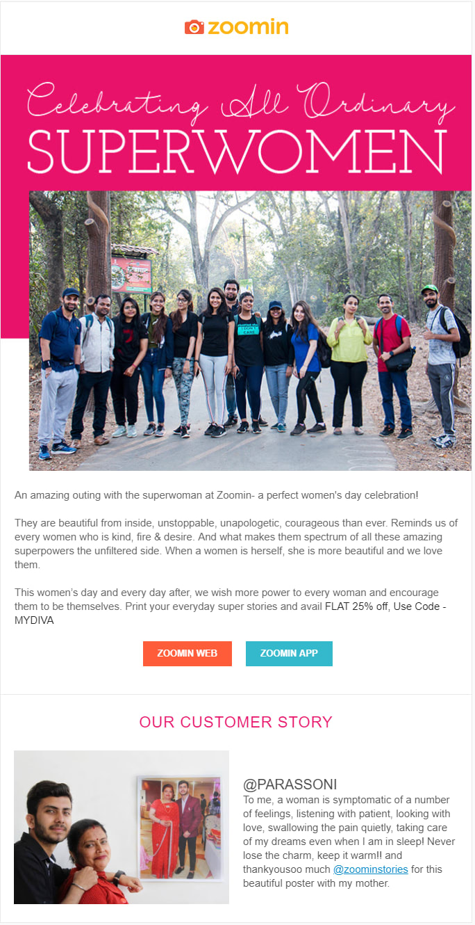 Consider how Zoomin, an app that offers high-quality photo prints, connects with its female subscribers by running a niche Woman’s Day campaign. Such targeted campaigns boost the number of opens and engagement, sending positive signals to email providers.