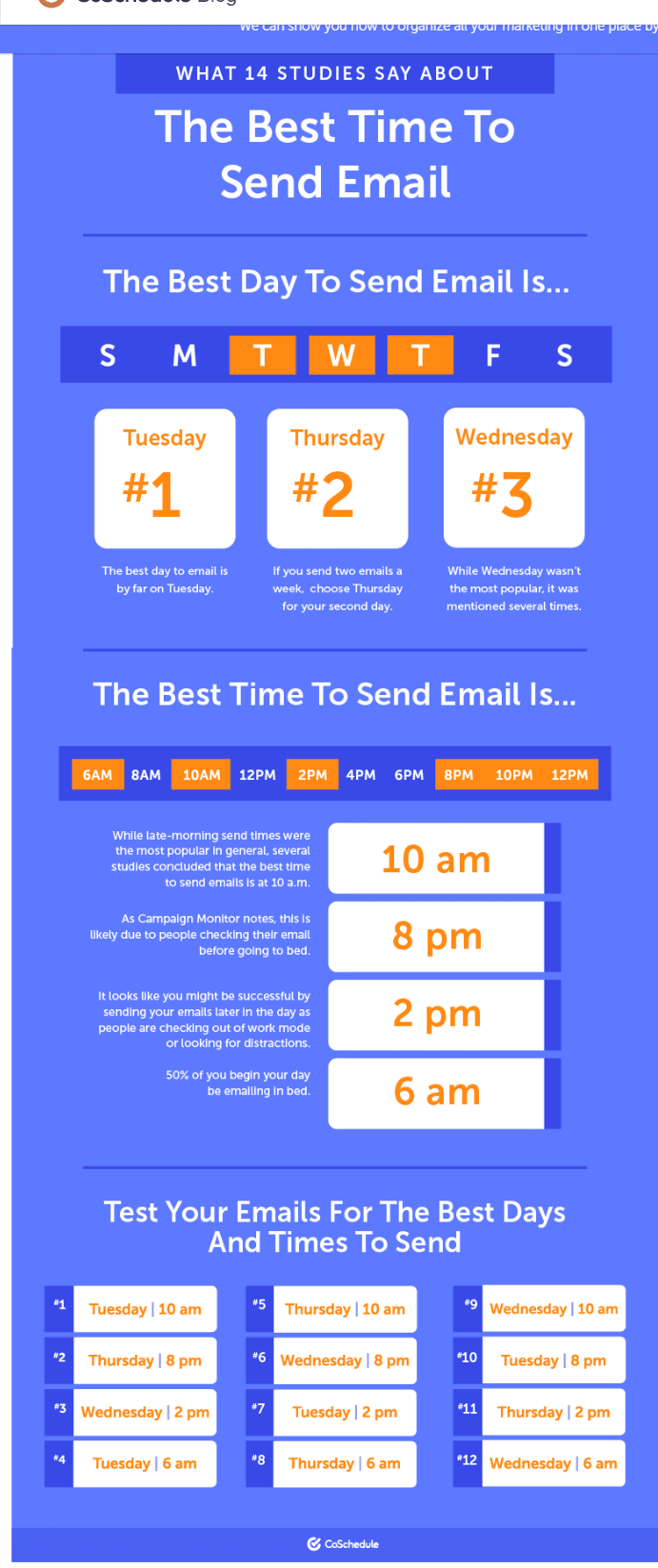 CoSchedule’s infographic shares an analysis of 14 separate research papers that study the best time and day to send emails. Here’s what they conclude.